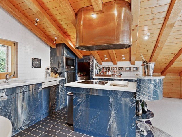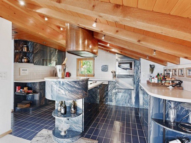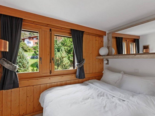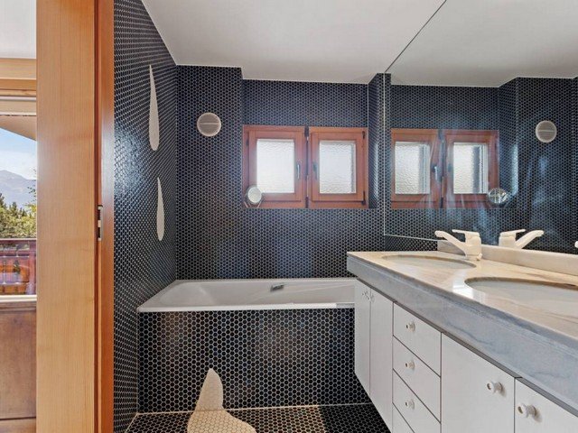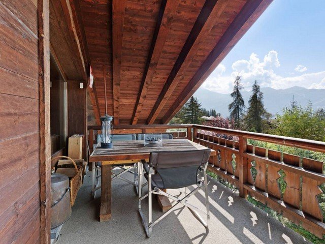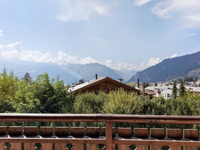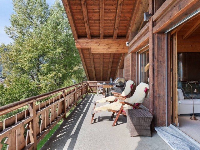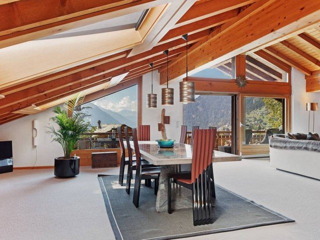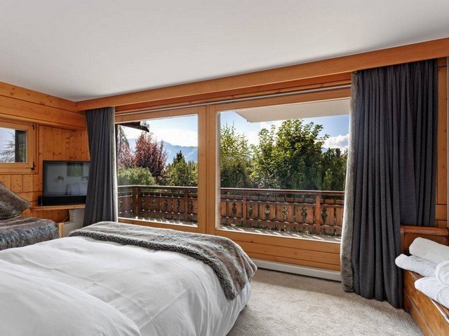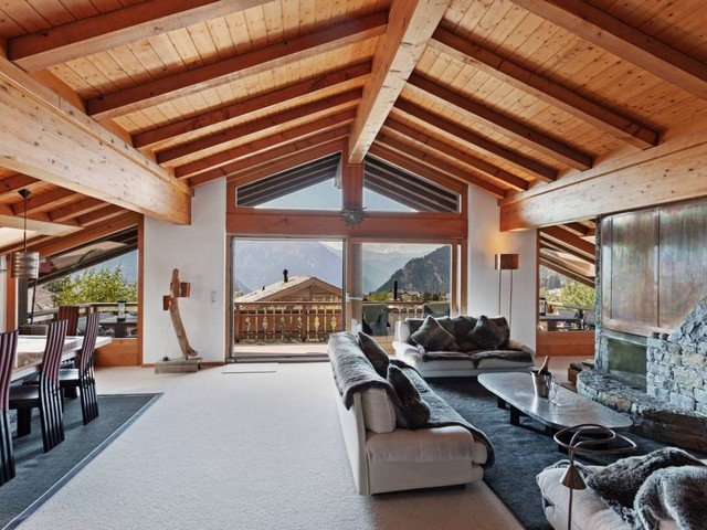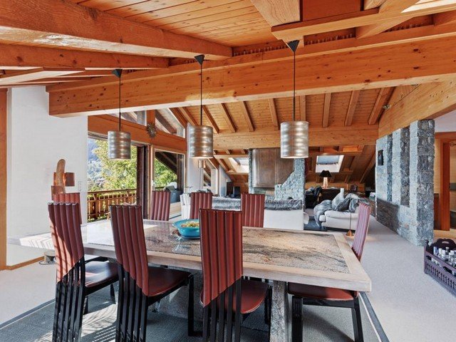 The vast and luminous open plan living space has a well-equipped kitchen that overlooks the dining area which comfortably seats eight. A double aspect fireplace separates the sitting area and the TV corner. Large floor to ceiling windows let in ample sunshine and give access to a south-facing balcony with views over the surrounding mountain range.