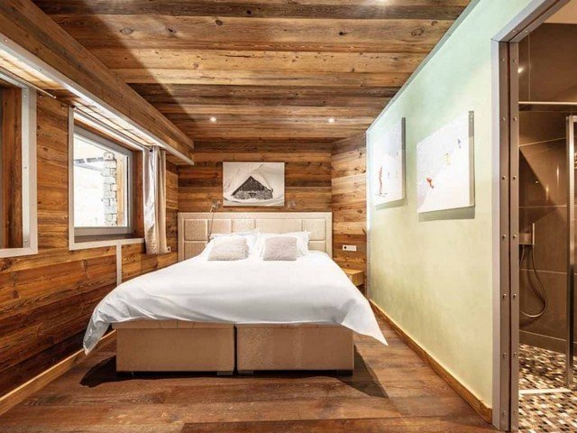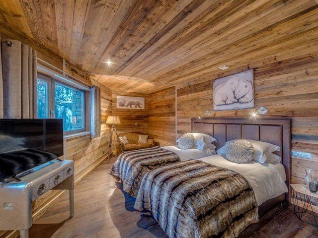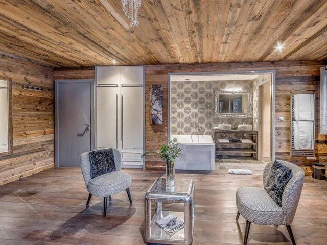 The chalet features five spacious bedrooms and five elegant bathrooms, including four double bedrooms and one twin room with two single beds — ideal for families or groups. Each room is tastefully designed with warm alpine materials, plush furnishings, and large windows framing the surrounding peaks.