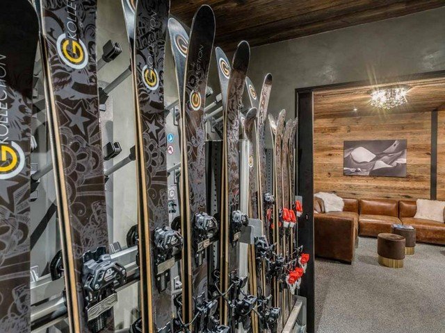 The heart of the chalet is its expansive living area, where soaring ceilings, exposed timber beams, and a cozy fireplace create a welcoming atmosphere for après-ski gatherings. The fully equipped gourmet kitchen and dining area provide the perfect setting for shared meals and entertaining.