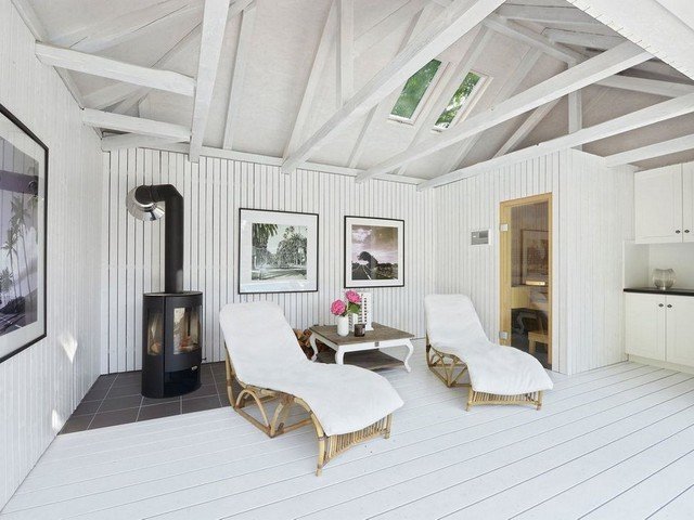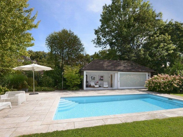- Pool and sauna house with adjoining equipment room, equipped with panoramic sliding glass wall, fireplace, kitchenette with refrigerator and sauna