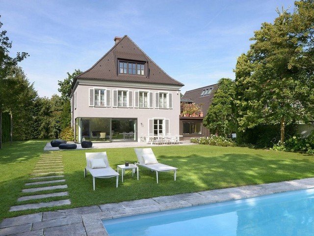 The villa was renovated with an excellent sense of style and furnished in an extremely representative manner; The renowned Munich office tools off.architecture is responsible for the design and implementation. Historical details such as the stylish front door, wooden shutters, wrought iron window parapets and the oak staircase have been preserved and create a perfect symbiosis with stylish design elements. An elegant white kitchen, a room-dividing natural stone fireplace, fine floor coverings, numerous fixtures and frameless panoramic corner windows with a view of the garden create an excellent living environment that meets the highest standards of comfort and aesthetics.