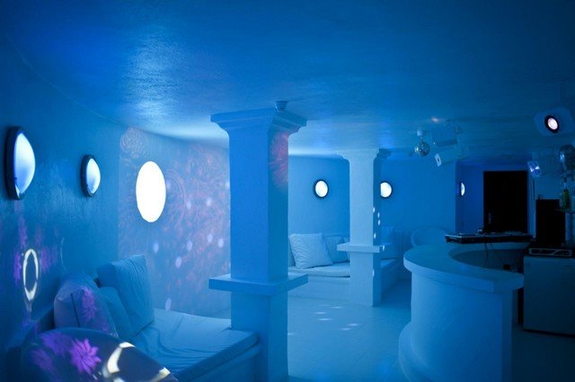 There is also a bar in the main living and dining area, where guests can whip up a cocktail before relaxing on the plush sofas surrounding the TV.