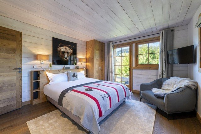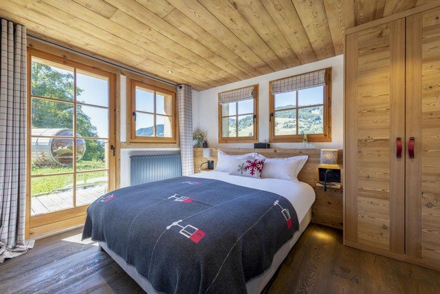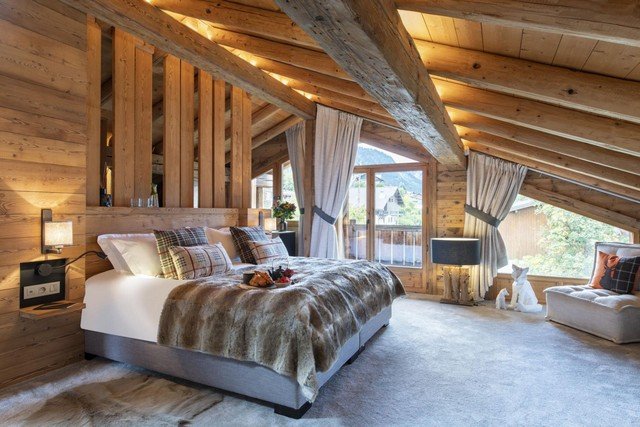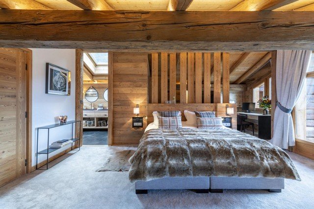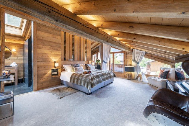 Sleeps up to 12 people, perfect for a larger family ski holidays. The star of the show is the master suite, which is located on the top floor of this luxury ski chalet. Imagine waking up under the eaves with the beautiful wooden beams criss-crossing above you. To your right are huge floor to ceiling windows that lets the morning light flood in.