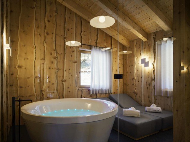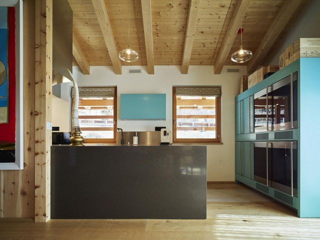 The chalet has been built with lots of natural wood, giving it a breezy mountain lodge style, although contemporary furnishings and a modern design help give Chalet Serge a unique feel unlike the traditional mountain chalets of old. An airy lounge with extra-tall ceilings hosts a plush 15-seater sofa, offering the 7 guests of the chalet plenty of room to relax after a day of skiing. Adjacent to this room you will find the dining and kitchen areas where the chalet’s bold style stands out. A spacious dining area with large square table suitable for as many as 14 guests backs onto a state-of-the-art steel and teal kitchen. The lounge and dining areas share a lengthy balcony, where you can relax with a refreshing apéritif and the stunning mountain views of the Dolomites as your company.