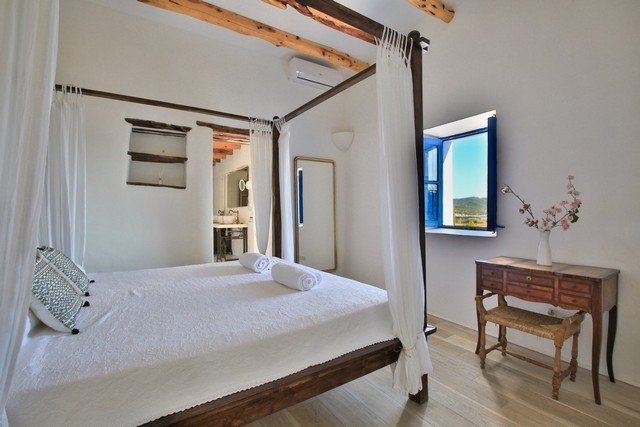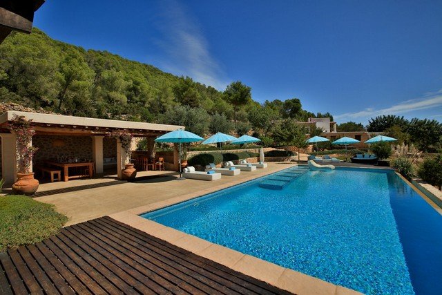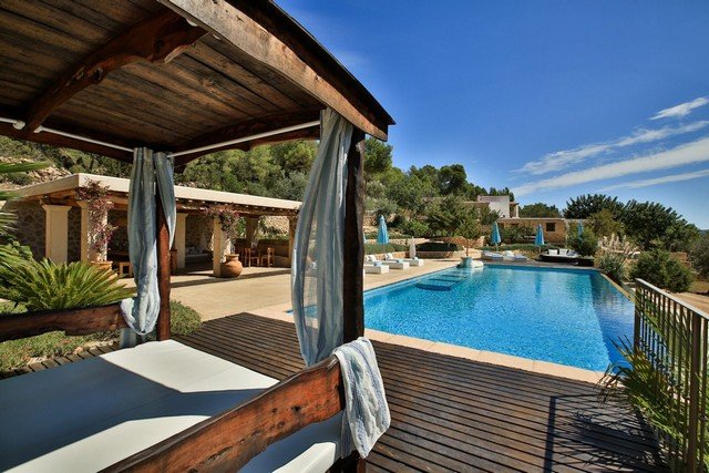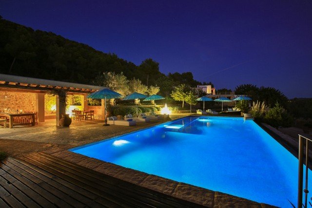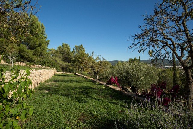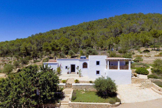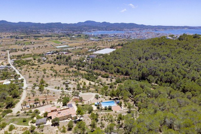 Located at the top of a hill, this property is secluded and surrounded on 3 sides by a pine forest, with 120,000 m2 of its own farm land. There is a distant sea view to the bay of San Antonio, to the hills of San Jose and a view of the town below.